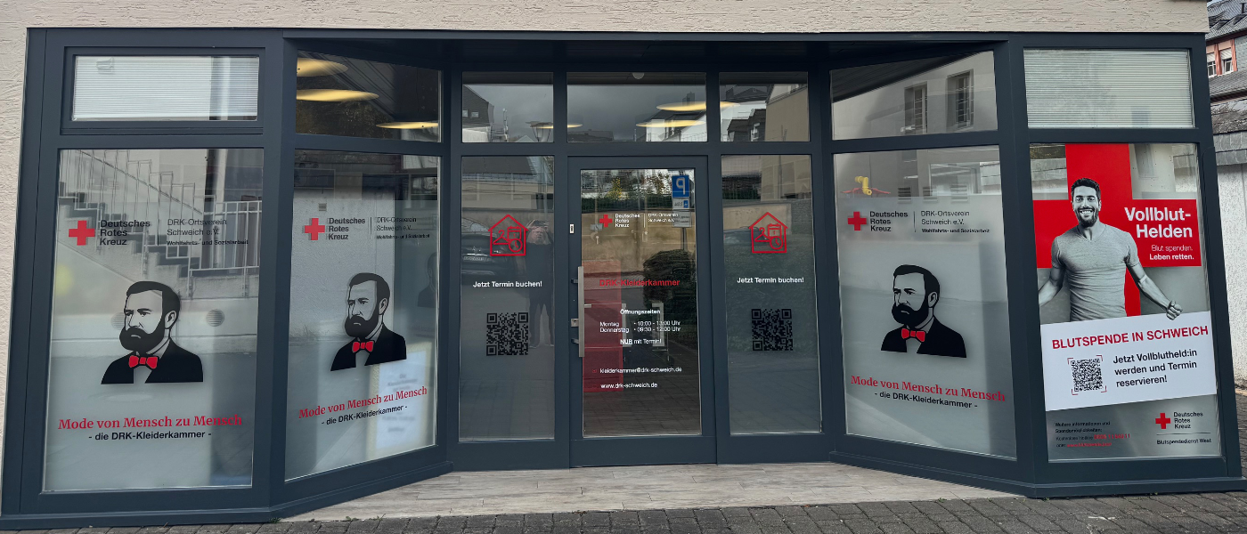 Der DRK-Ortsverein Schweich freut sich über den Umzug der Kleiderkammer in neue, deutlich großzügigere Räumlichkeiten. Die neue Location bietet nicht nur mehr Platz, sondern überzeugt vor allem durch ihre moderne und freundliche Gestaltung: große Schaufenster sorgen für viel Licht, einladende Farben und eine übersichtliche Raumaufteilung schaffen eine angenehme Atmosphäre – sowohl für Besucherinnen als auch für unsere Helferinnen.